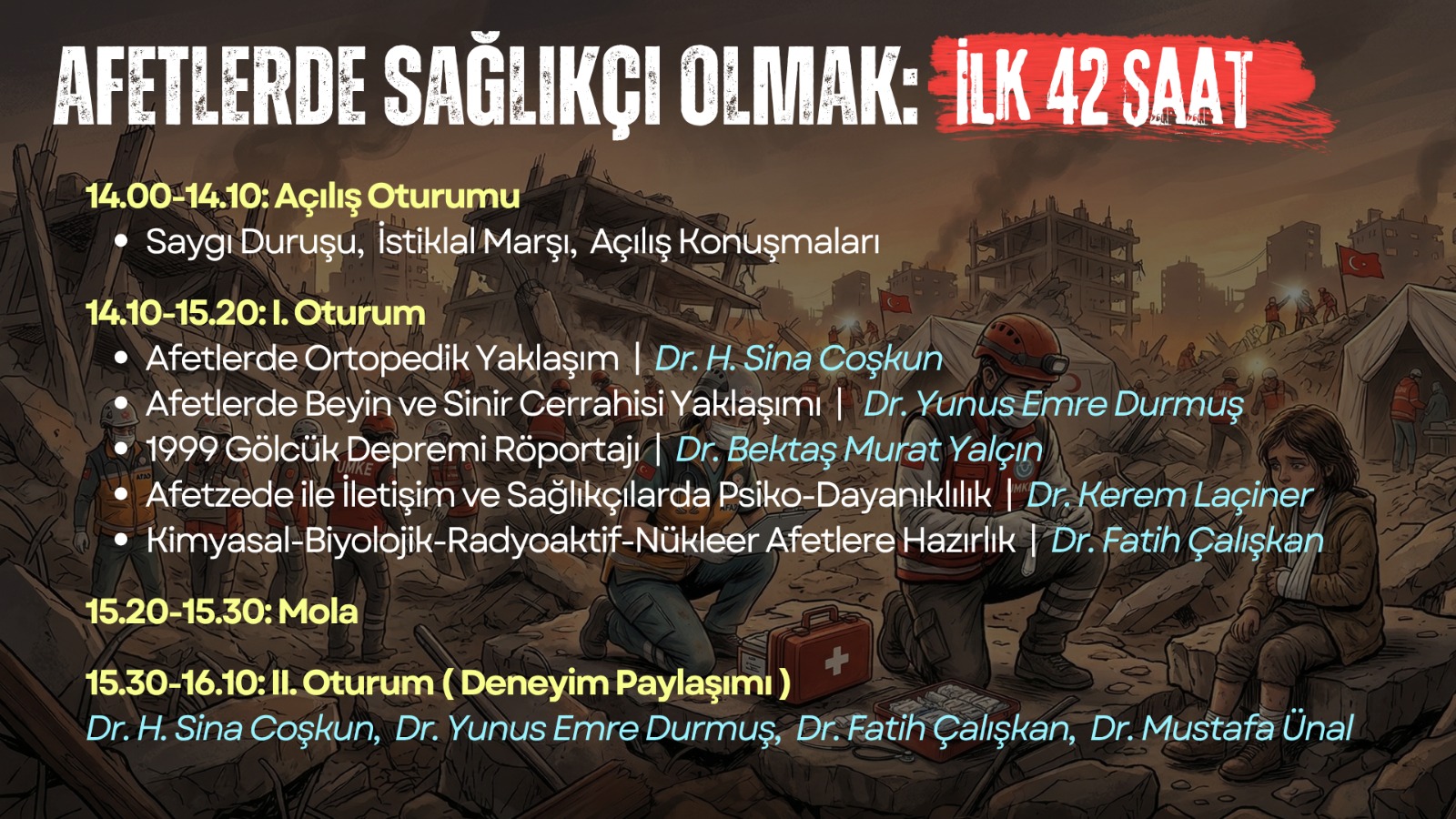 Bu soruya cevap aradığımız, fakültemizde gerçekleştirilen sosyal sorumluluk projelerinden biri olan “Afette Sağlıkçı Olmak: İlk 42 Saat" projesi kapsamında düzenlenecek olan "Afette Sağlıkçı Olmak: İlk 42 Saat" sempozyumunda afet sonrası kritik ilk 42 saatte neler yaşandığını ve sağlıkçı olarak sahada nasıl fark yaratabileceğimizi konuşacağız. Afetin tıbbi ve psikolojik yönlerini öğrenirken afet bölgesinde çalışmış hocalarımızın deneyimlerini dinleyeceğiz. Bir afet ülkesinin doktorları olarak bu önemli sempozyuma hepinizi bekliyoruz!